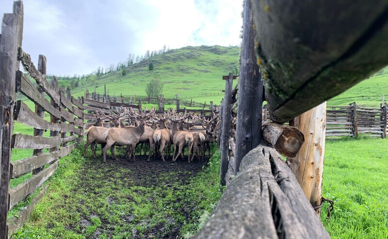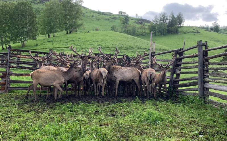 Маралы в расколе-ограждении, ведущему к станку для срезки рогов