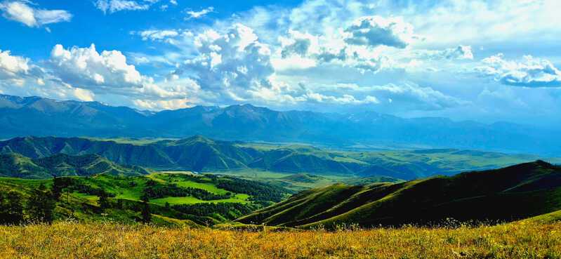 Урочище Актомар. Панорамный вид на долину Бухтармы и хребет Сарымсакты