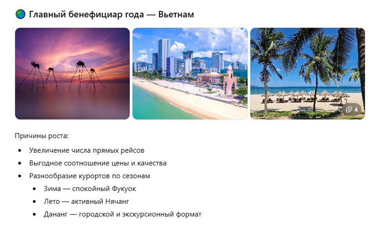 Главный бенефициар 2025 года – Вьетнам, доля которого выросла в пять раз. Рост объясняется увеличением числа рейсов, прямыми перелётами, выгодным соотношением цены и качества, а также разнообразием курортов под разные сезоны — зимой туристы предпочитают спокойный Фукуок, летом – оживлённый Нячанг. Дананг становится доступным и удобным курортом с развитой городской и пляжной инфраструктурой и богатой экскурсионной программой.