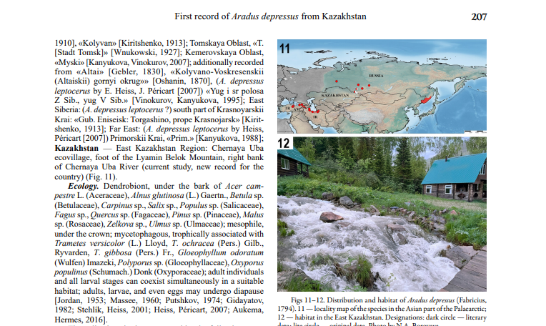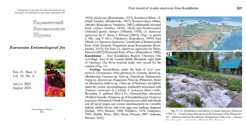 Во время полевых исследований в Западном Алтае на турбазе «Экопосельее Чёрная Уба» прошедшим летом исследователи Глеб Болботов и Валентин Рудой обнаружили редкий вид клопа – Aradus depressus (Fabricius, 1794). Это первая зарегистрированная находка данного вида на территории Казахстана. Недавно в Евразиатском энтомологическом журнале вышла публикация об этом открытии.
