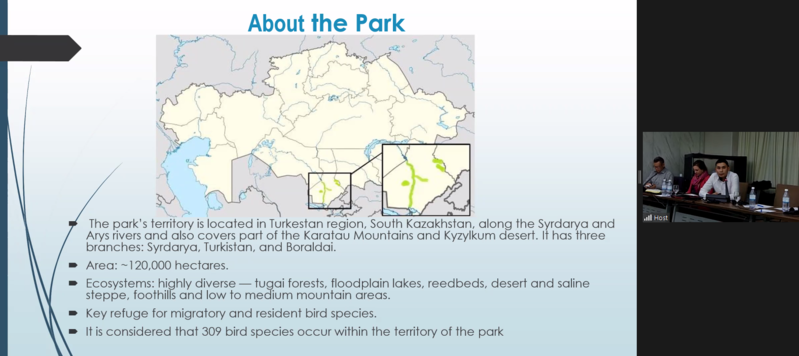 С презентацией «Обзор орнитологической работы в Сырдарья-Туркестанском государственном региональном природном парке и его роль для CAF выступил Сырымбет Жарылкасынов, научный сотрудник Сырдарья-Туркестанского ГРПП.