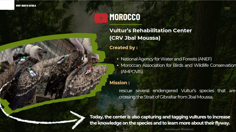 Северная Африка играет ключевую роль в евро-африканском миграционном пути птиц: миллиарды пернатых ежегодно пересекают регион. Здесь проходит около 600 видов мигрирующих птиц, у них три основных маршрута через Марокко и Испанию (Гибралтар), из Туниса в Италию и через Египет. Одна из наших инициатив – это Центр реабилитации грифов в Марокко.