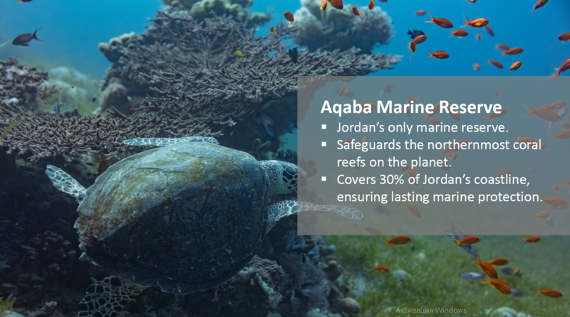 Одной из историй успеха стало создание морского заповедника Акаба Marine Reserve – единственного морского заповедника в стране. Он охватывает 30 процентов прибрежной зоны, где охраняются коралловые рифы, морские экосистемы и перелётные птицы.
