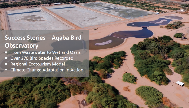 Другой пример – орнитологическая обсерватория Акаба. Ранее на её месте находился завод по переработке сточных вод. Сегодня эта территория преобразована в водно-болотный оазис, где очищенная вода повторно используется для поддержания экосистемы. Эта зона признана одной из самых важных точек остановки для перелётных птиц в регионе.