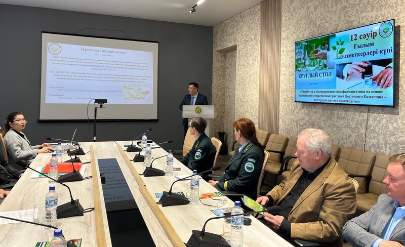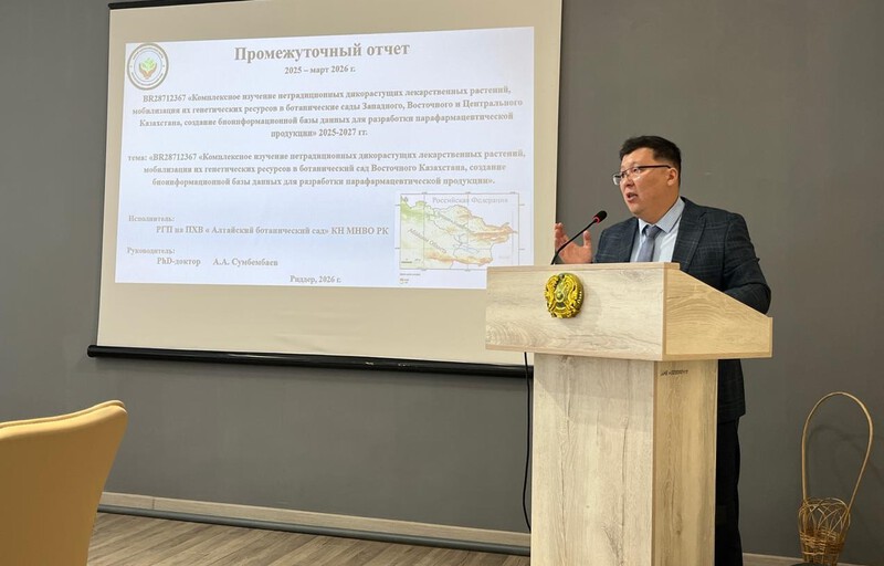 Айдар Сумбембаев представил участникам круглого стола промежуточный отчёт о проделанной работе по проекту, рассчитанному на 2025-2027 гг., «Комплексное изучение нетрадиционных дикорастущих лекарственных растений, мобилизация их генетических ресурсов в ботанические сады Западного, Восточного и Центрального Казахстана, создание биоинформационной базы данных для разработки парафармацевтической продукции».
